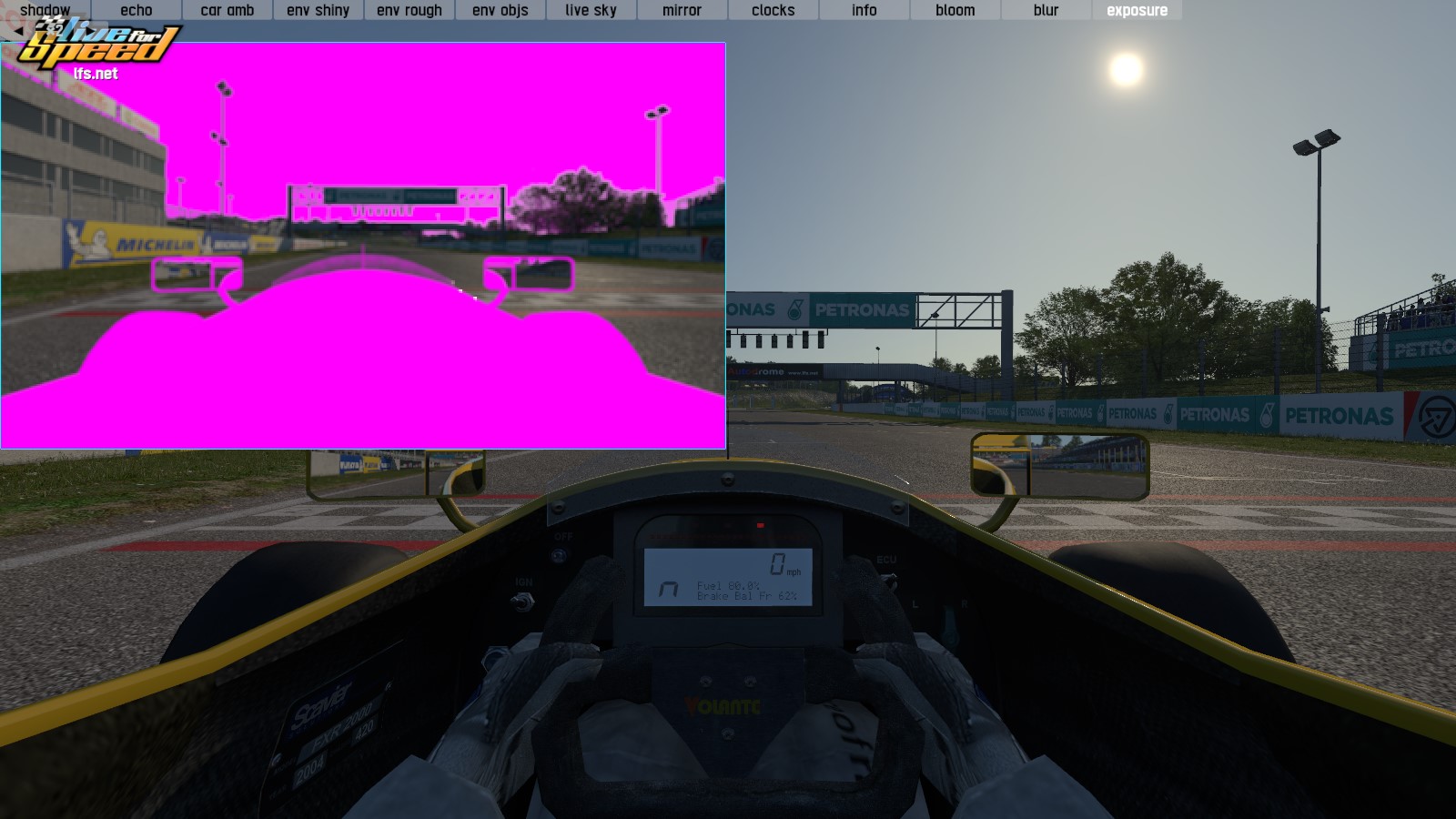Alfa kanalını kullanarak manzarayı tanımlamak için bir numara kullandım. Gökyüzünü (her kare) ve kendi arabanızın içini sürüş görünümünde işlerken, piksellerin alfa kanalının sıfıra ayarlandığından emin oldum (şeffaflık gibi). Manzara çizilirken alfa kanalı şeffaf olmayacak şekilde ayarlanmıştı. Bu nedenle, pozlama hesaplaması için histogramı oluşturmak üzere okunan görüntü buna benzer görünüyor. Macenta, alfa kanalının sıfırda bırakıldığı yeri gösteriyor.